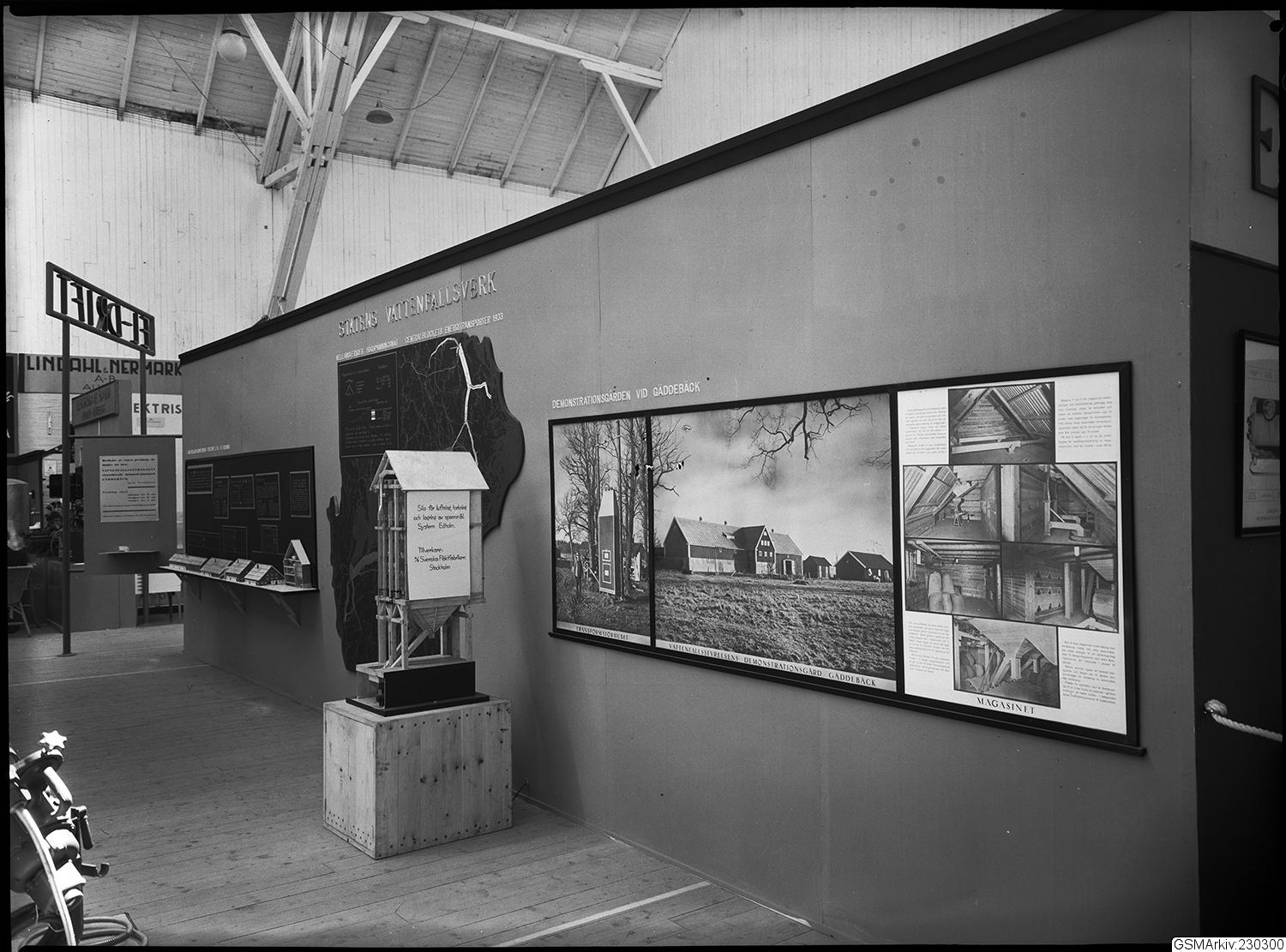 Monter på Svenska Mässan, utställare Statens Vattenfallsverk visar Lantbruksbyggnaders rationella utformning. Vattenfallsstyrelsens demonstrationsgård vid Gäddebäck.