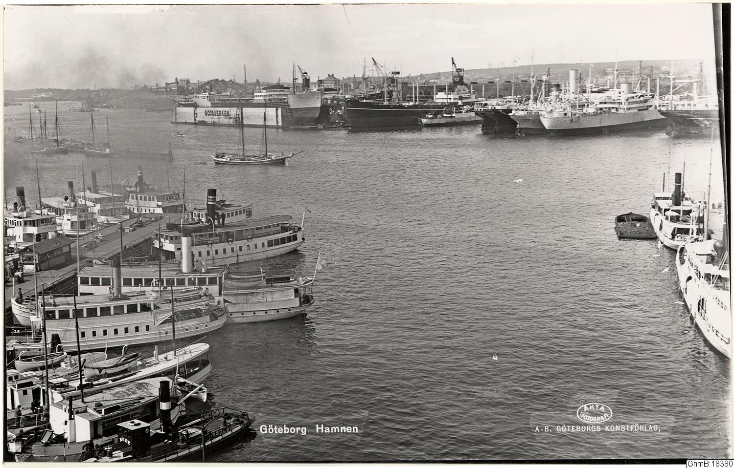 Utsikt över Göteborgs hamn, Stenpiren med skärgåtdsbåtar till vänster, till höger anas Träpiren. På andra sidan Göta Älv syns Götaverken.
