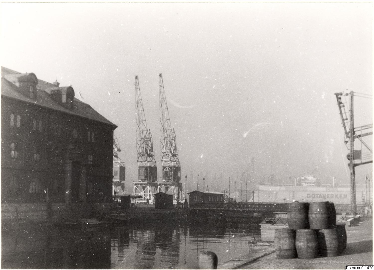 Vy med Lagerhuset och Rosenlundskanalen, blick mot norr och Hisingen med Götaverken i fonden.