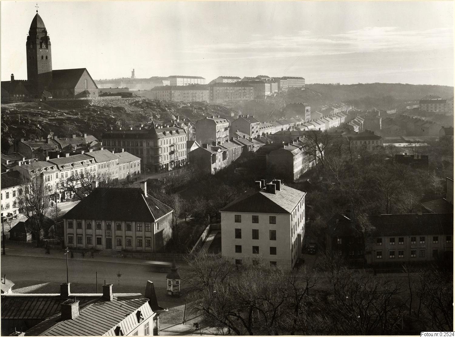 Utsikt från Sjömanstornet över Stigbergstorget och Gathenhielmska huset. Till vänster Masthuggsbergen och Masthuggskyrkan
