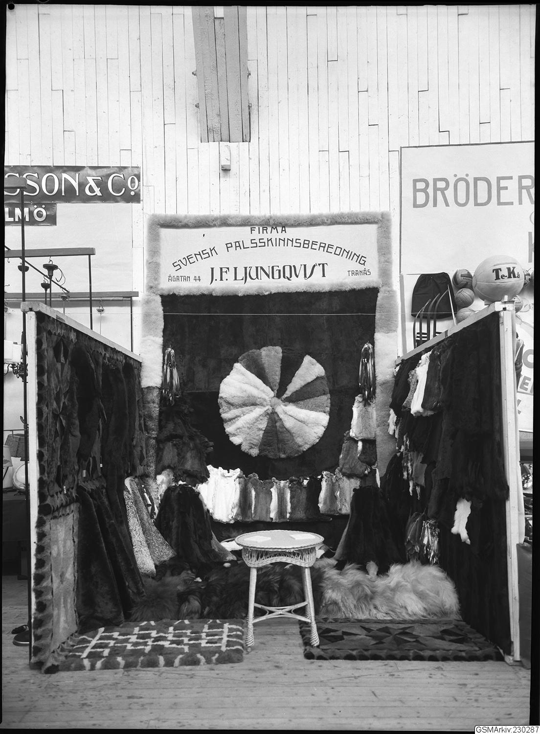 Montrar på Svenska Mässan, utställare Firma Svensk Pälsskinnsberedning, J. F. Ljungqvist, Ågatan 44, Tranås. Firman etablerad 1915. Bereder och färgar pälsskinn samt tillverkar dampälsar, capes och pälskragar bland annat.