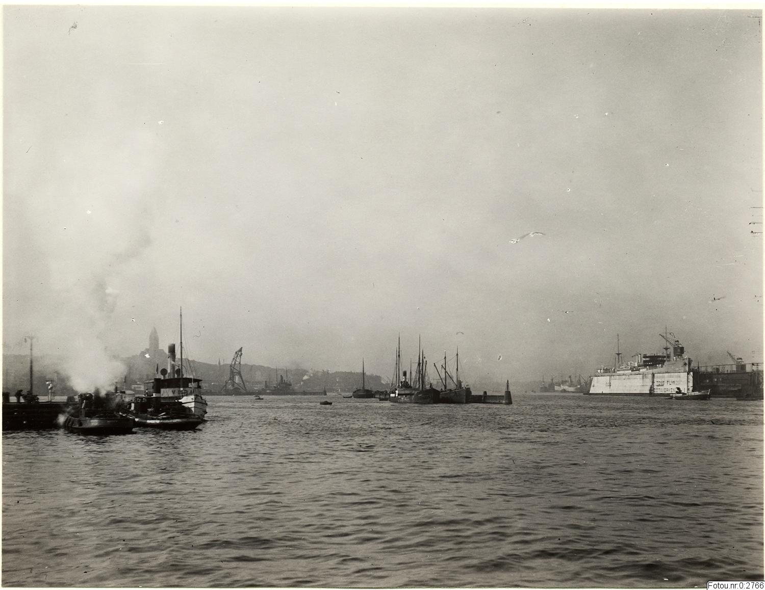 Vy över Göteborgs hamn, blick västerut. Till vänster syns Masthugget och till höger Götaverken.