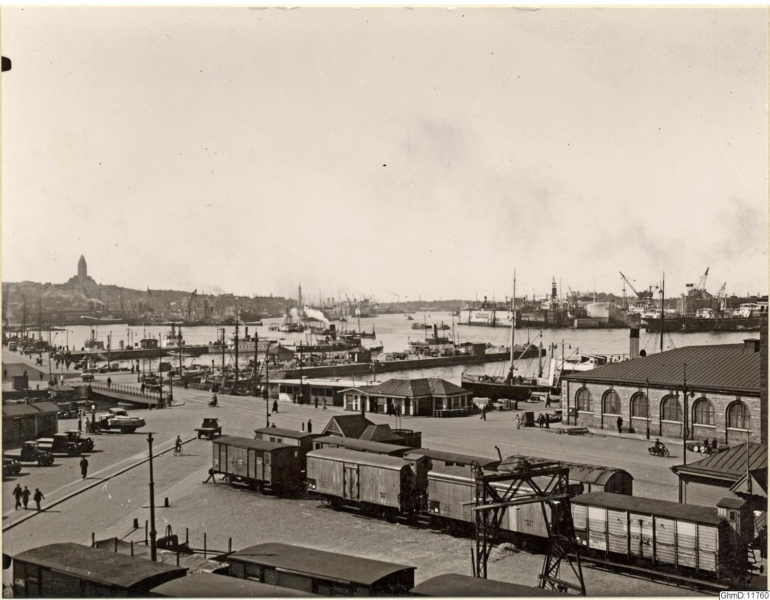 Göteborgs hamn vid Stora Bommen med utsikt mot Hisingen och Götaverken. Till höger syns Tullpackhuset.