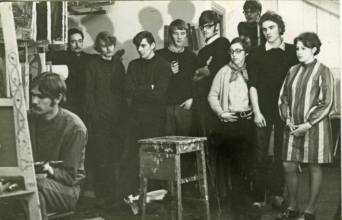 Gruppbild Gamla Toltorpsskolan. En oidentifierad man sitter och målar flera elever i Mölndals Målarskola tittar på.