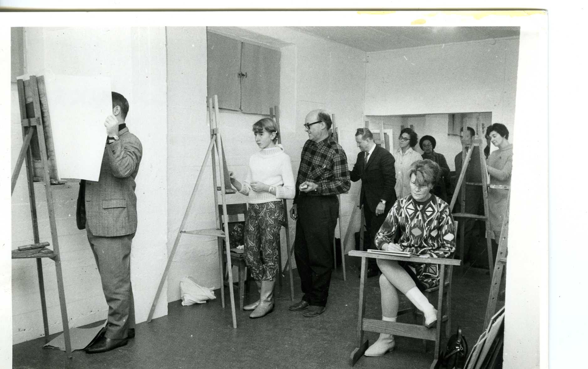 En grupp studenter med lärare Ebbe Gustafsson, Mölndals Målarskola på Tempelgatan.
