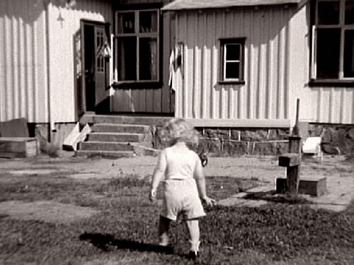 Exteriör. Litet barn på gårdsplan med en träpump. Fastarpsvägen, Tvååker.