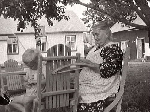 En kvinna (oidentifierad) med hushållsarbete (spritar ärtor?) utomhus i en trädgård. Vid grinden står en pojke, troligen Rolf Mattsson. I bakgrunden bostadshus och ekonomibyggnad. Fastarpsvägen, Tvååker.