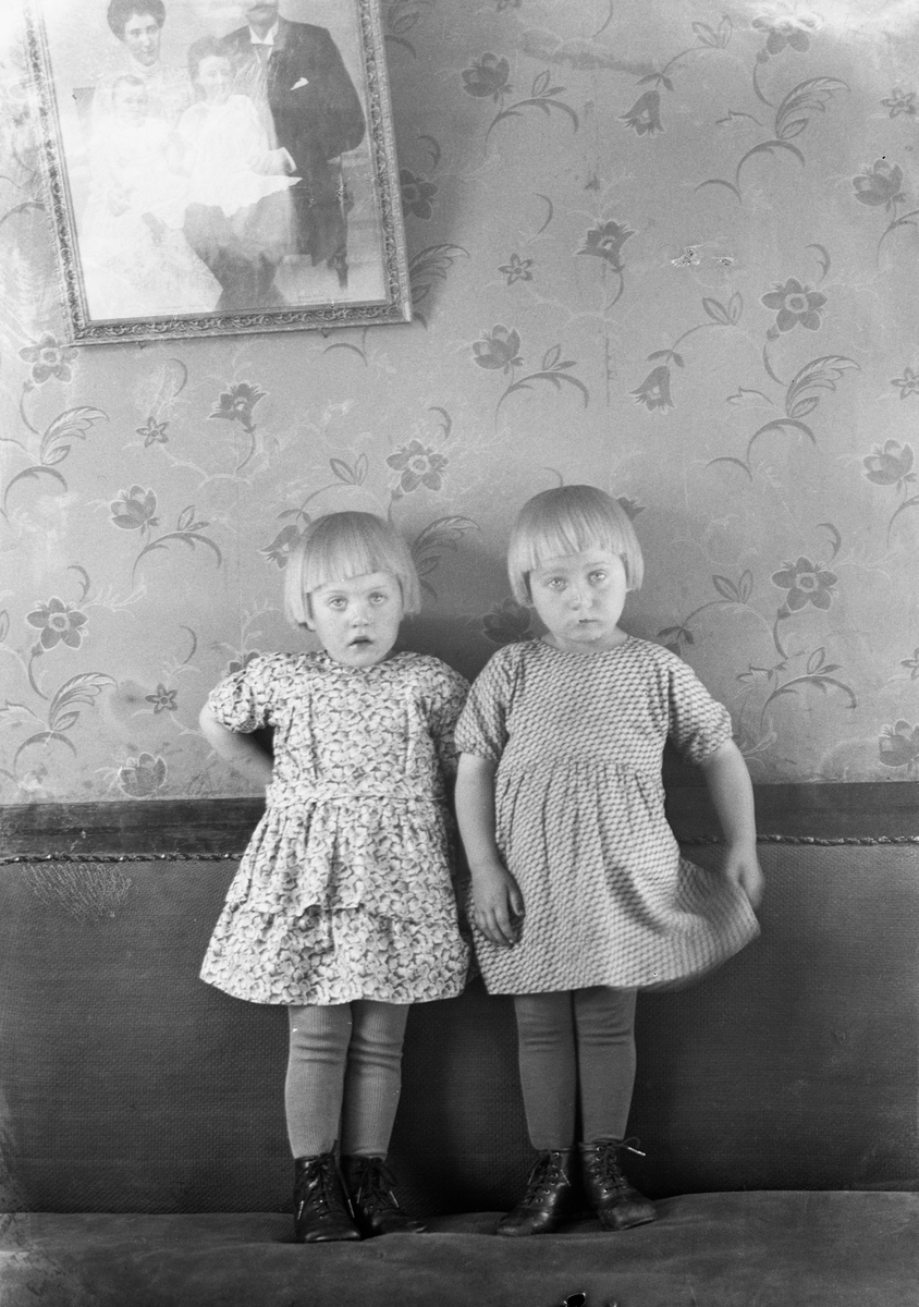 Tvillingarna Maria och Margit (Elisabeth) Johansson fotograferade när de står i soffan i Margits fosterhem. Deras mor födde dem på Lia-hemmet (Fagereds sanatorium), där hon vårdades för TBC, så flickorna hamnade i olika fosterhem. Vid den här tiden bodde Margit i Tvååker hos Augusta Karlsson, som var granne med fotografen, och Maria i Järnmölle i samma socken.