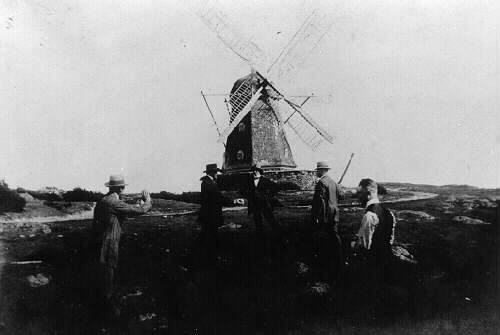 "Väderkvarn. Lägst till vänster: Bror Boman lärare i Stamnared. Övriga: Georg Lundberg, Jakob Thölin från Spannarp och Albin Nilsson Från Kungsbacka."