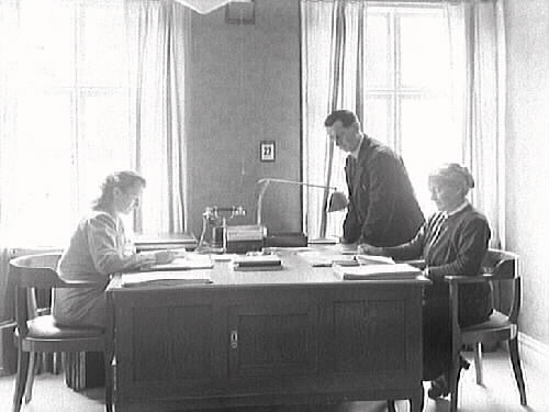 Varbergs Erkända Sjukkassa. Syster Ellen Johansson, Gunnar Benson och Rut Henriksson kring skrivbordet. Kontoret låg på Torggatan 26 i kv Sadelmakaren.