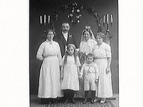 Brudpar. Birger Andersson från Tofta med fru, tärnor och brudnäbbar. I bakgrunden en ärebåge och kandelabrar på pelare.