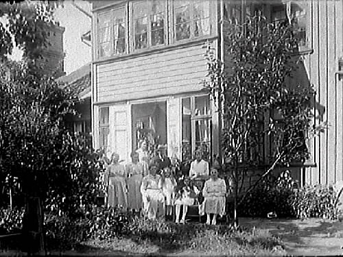 Gruppbild av människor utanför en villa. Möbelhandlare C J Carlsson beställde bilden och är troligen själv med.