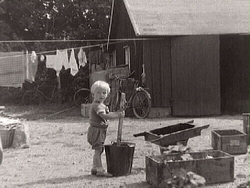 Ett litet barn leker ute på en gård där det bl a hänger tvätt. Det kan vara charkuterist Gustaf Petterssons uthus där slaktningen skedde i just den här porten.