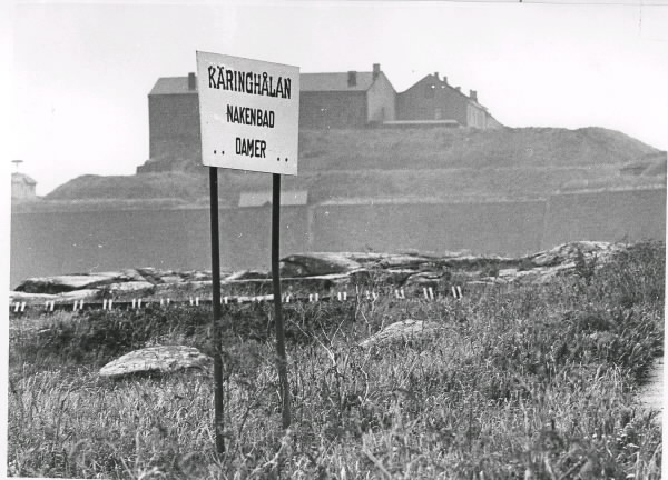 Skylt för nakenbad för damer vid Käringhålan i Varberg, med Varbergs fästning i bakgrunden. Käringhålan är det nordligare dambadet och Skarpe Nord ligger söder därom.