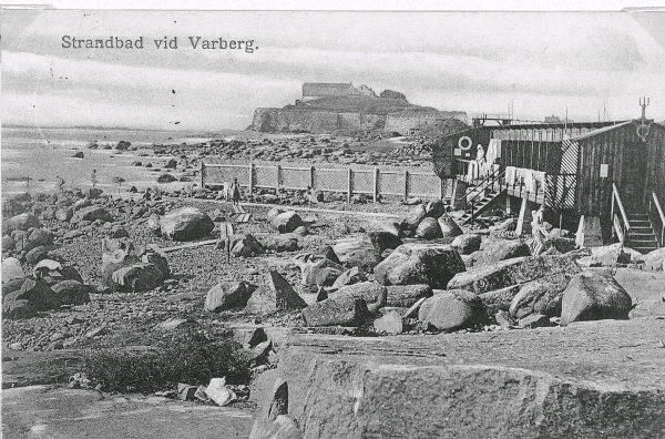 Badliv på damernas strandbad Skarpe Nord sedan badhytter och cementgång ned till vattnet, där en ledlina tog vid, uppförts. Här syns att även träspänger lagts ut över den steninga stranden fram till cementgången. Badhytter fanns även vid männens badplatser Goda Hopp och Djupa Dräkt. Påbudet då var dock att badkläder skulle användas och sådana hyrdes därför ut av badföreståndarna. Nakenbad bland herrar i större omfattning etablerades tidigare än bland kvinnorna, där det dröjde till fram mot 1920-talets slut.