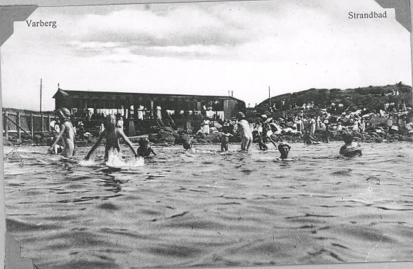 Vykort, "Varberg. Strandbad". Badande med badhytterna i bakgrunden vid Skarpe Nord, då damernas badplats och sedermera nakenbad. Stadens styrande ville få folk att använda badkläder på 1910-talet, så hytternas badföreståndare hyrde ut sådana. På hytthusets räcke hänger badhandukarna på tork och påklädda badbiträden står och ser ut över de badande. Mot 1920-talets slut hade badplatsen utvecklats mer till ett nakenbad för kvinnor.