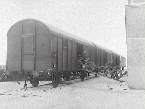 Inlastning vintertid av cyklar från Monark i en godsvagn.