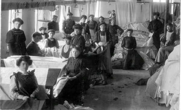 Kvinnliga textilarbetare omgivna av stora tygsjok. Interiör från dåvarande Skandinaviska Textilfabriken i Varberg, senare Varbergs yllefabrik och från 1912 Malmö Yllefabriks AB. Här var en av få industrier där kvinnor kunde få jobb och vid år 1900 var de i klar majoritet av de ca 100 anställda vid sekelskiftet 1900. Först tillverkades endast bomullstyger men från 1906 även ylletyger.