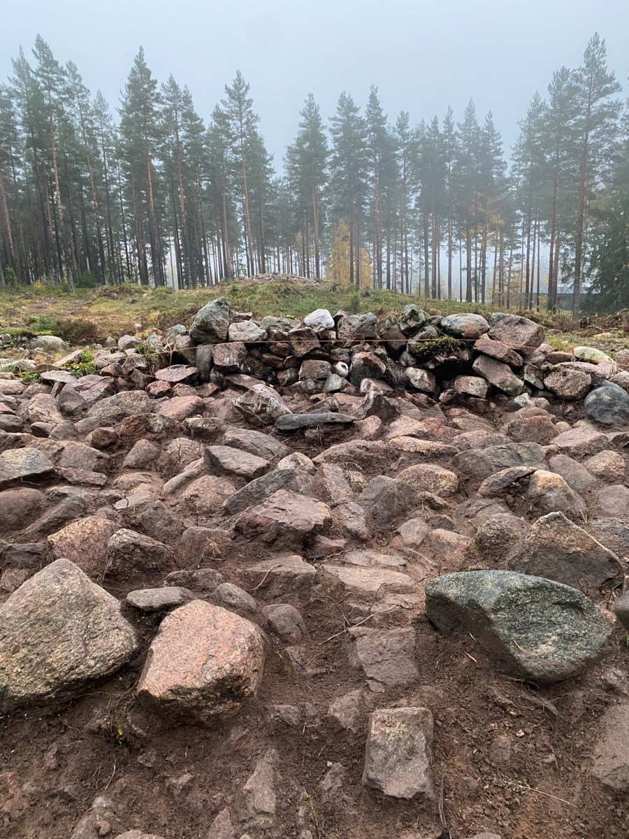 En stensättning, L1970:3018 under utgrävning med stensättning L2022:2590 i bakgrunden. Platsen är fastigheten Gunnarsbo 1:3, nordväst om Mullsjö i Jönköpings län.
