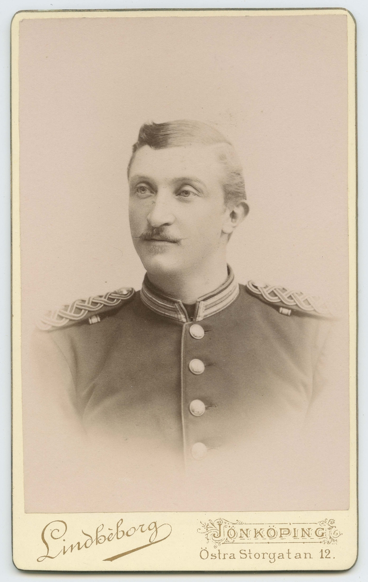 Porträtt på Militär på I12 Jönköping. Christer Malkolm Hugo Key-Åberg född1858-09-10 och död1922-10-19.