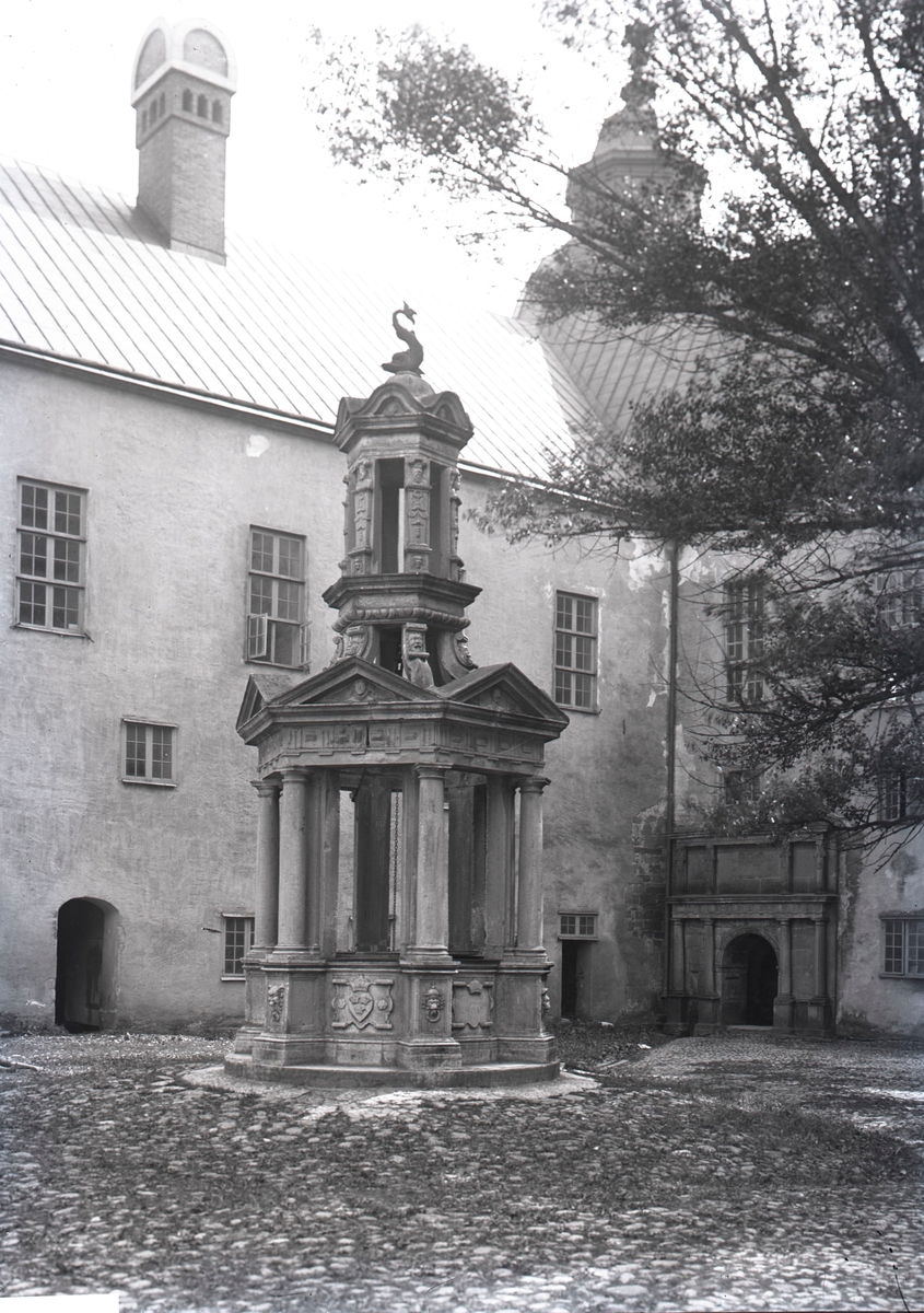 Brunnsöverbyggnad från år 1578. Renässansborggård.