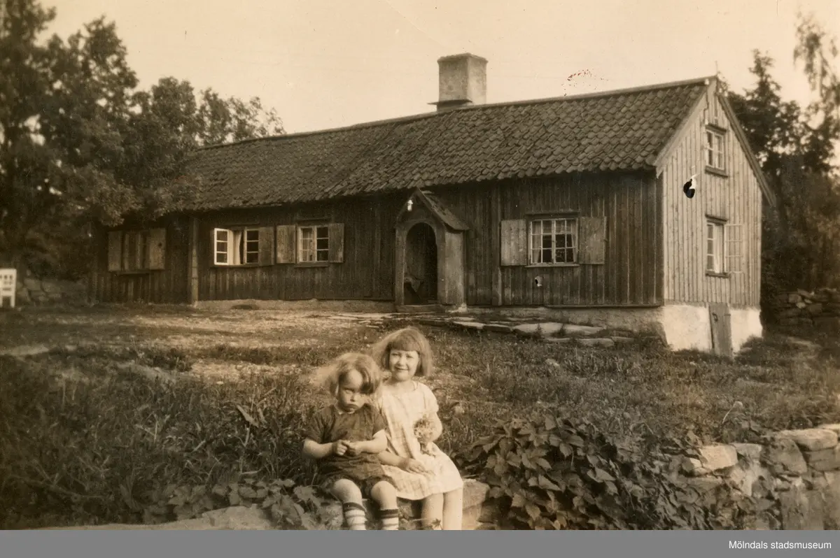 Två små flickor sitter framför Kållereds äldsta hus - Hultet 1:2 Talinssons gård (även Thalinssons) i Risås backe.