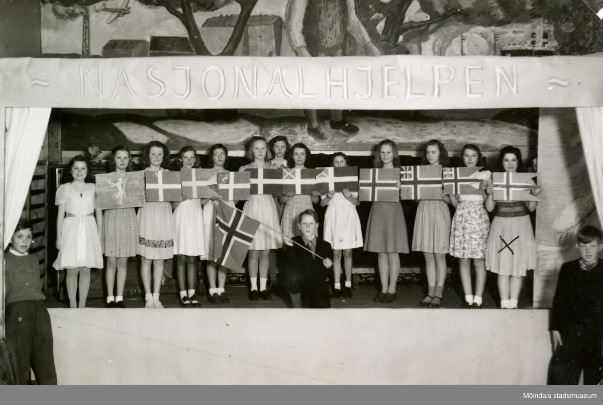 Två skolpojkar står framför ett stort foto med avfotograferade norska skolbarn som håller svenska och norska flaggor i händerna. Ovanför fotografiet står texten "Nasjonalhjelpen" (läs: Svenska Norgehjälpen), 1940-45 okänd plats.