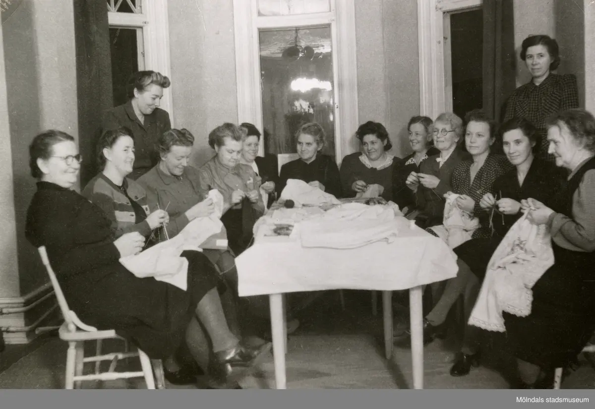 Röda korset har symöte, 1940 - 1945. De höll till i kommunalhuset där det även fanns samlingshus och badhus. Byggnaden låg på platsen där servicehuset nu ligger. Kvinnorna ordnade inför basar för att samla in pengar. Förteckning över namn finns i Kållereds hembygdsförenings arkiv under 228.