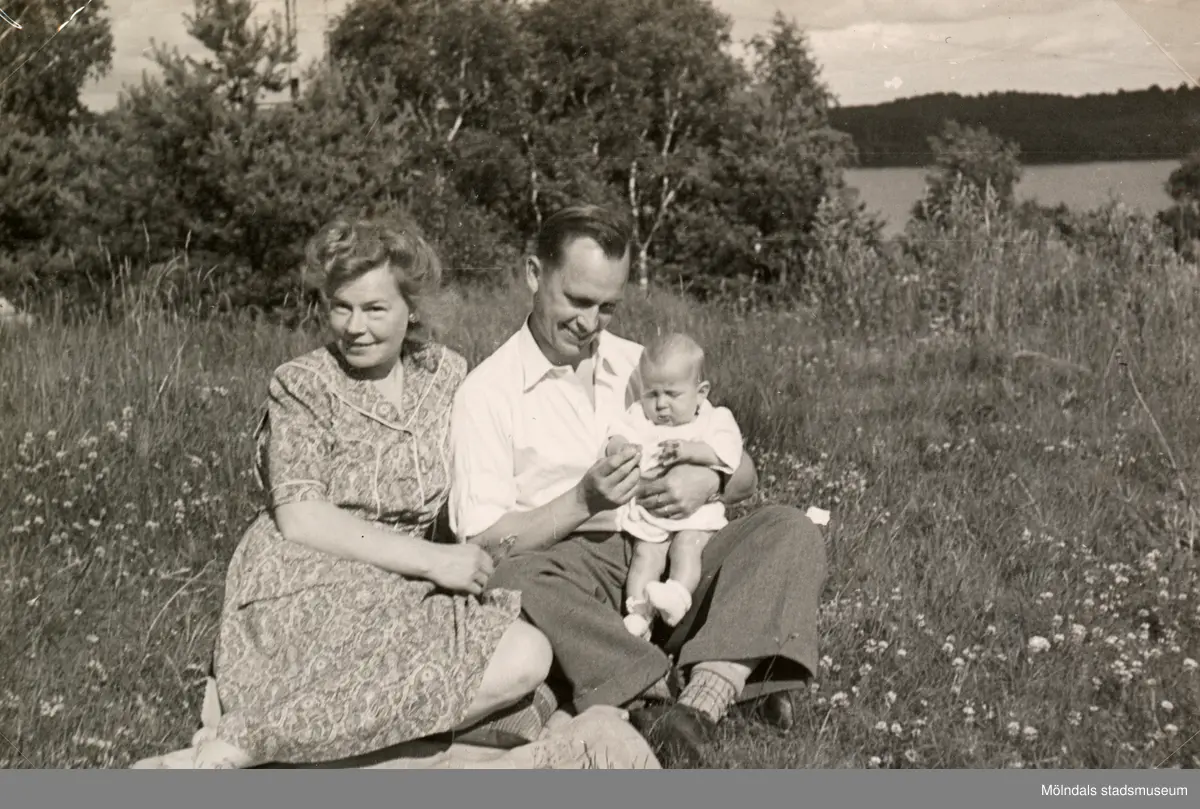 Östen Krantz (1910 - 1990), hustrun Edit (1915 - 2008, född Törner) och dottern Stina sitter i slänten ner mot Tulebosjön år 1946. Tulebosjön ses i bakgrunden.