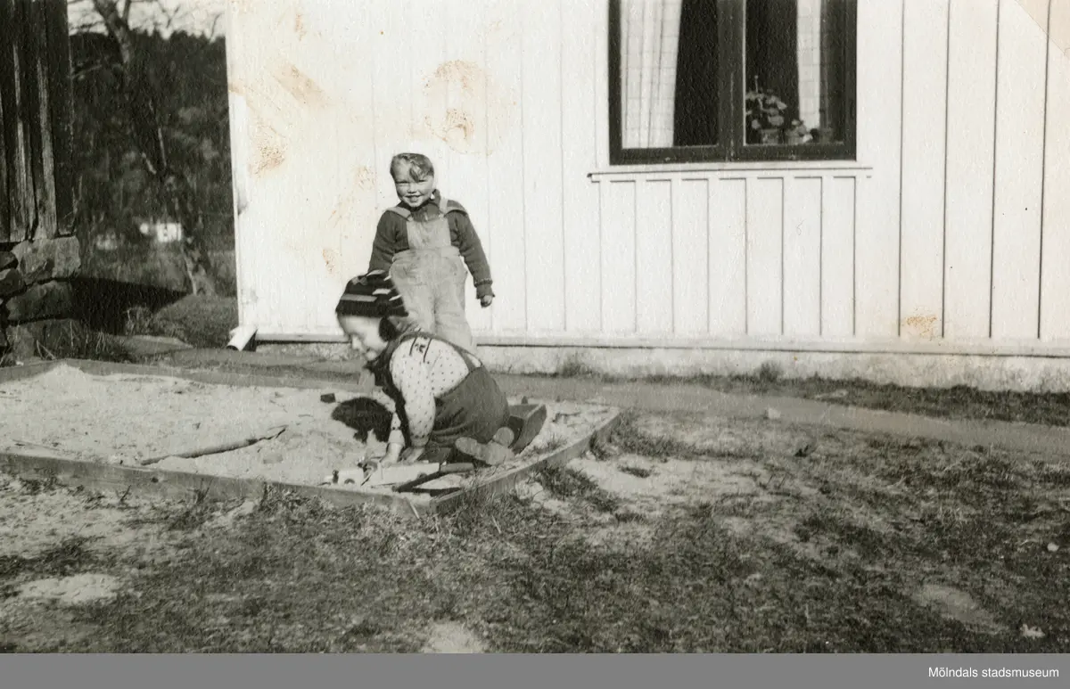Kjell Johansson (född 1945) och Eva Pettersson (född 1944, gift Kempe) leker i sandlådan vid Torrekulla gård 1947. På bottenvåningen bodde familjen Johansson, familjen Pettersson hyrde på andra våningen.