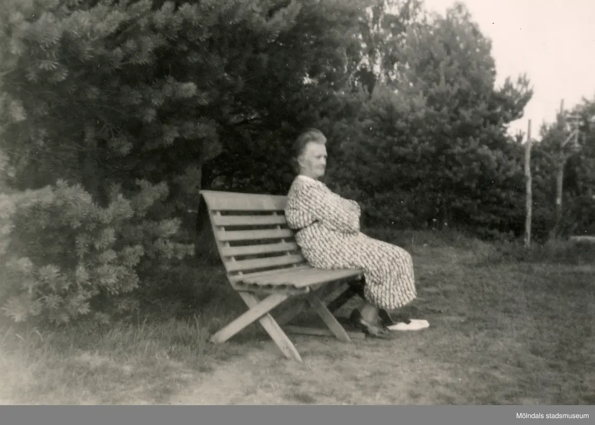 Nora Krantz (1879 - 1955) sitter på en bänk i trädgården utanför hemmet (Stretereds personalbostad på Tulebovägen 23-27 i Stretered). Nora var gift med skomakaren Carl Krantz som arbetade på Stretereds skolhem. Nora och barnen flyttade till det då nybyggda huset i Stretered 1921. Carl flyttade dit tidigare, först inhyst i Sporred.