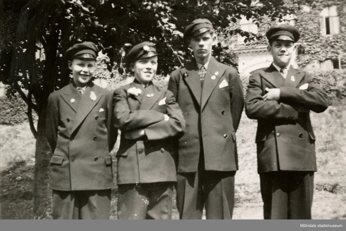 Fyra manliga konfirmander står framför Stora skolan, 1930-tal. I bakgrunden ses Stretereds vårdhem.