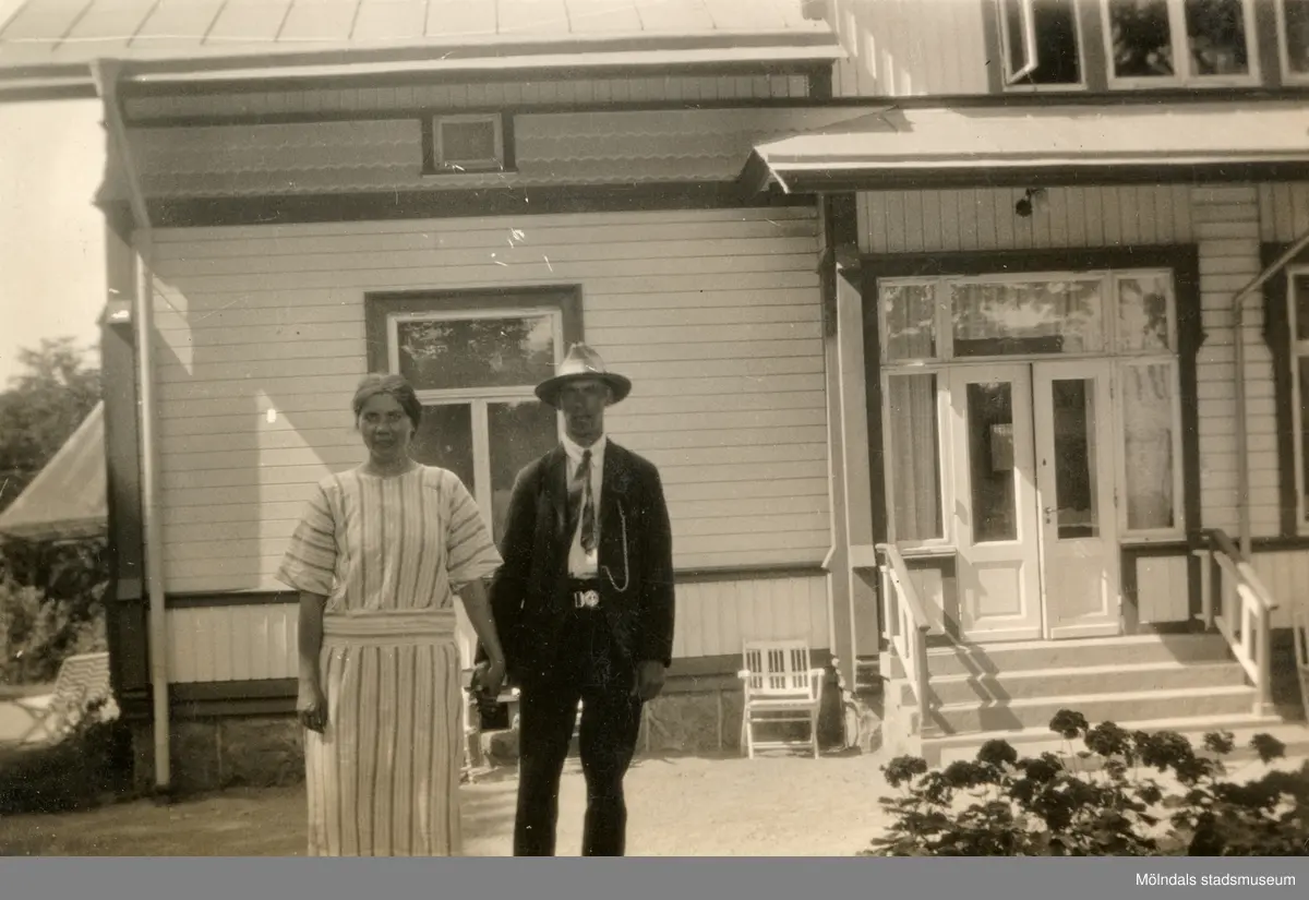 Ruth och Fritjof, boende på Stretereds vårdhem (han i alla fall), står framför en villa på Stretereds område. Osäkert vilket hus, men kan också vara på en utflykt. Fritjof var kompis med polisen. Ibland tog han sig in till Göteborgs stad, och vid tillfälle lånade han deras mössa och fick dirigera trafiken. De lät honom vara med och delta.
