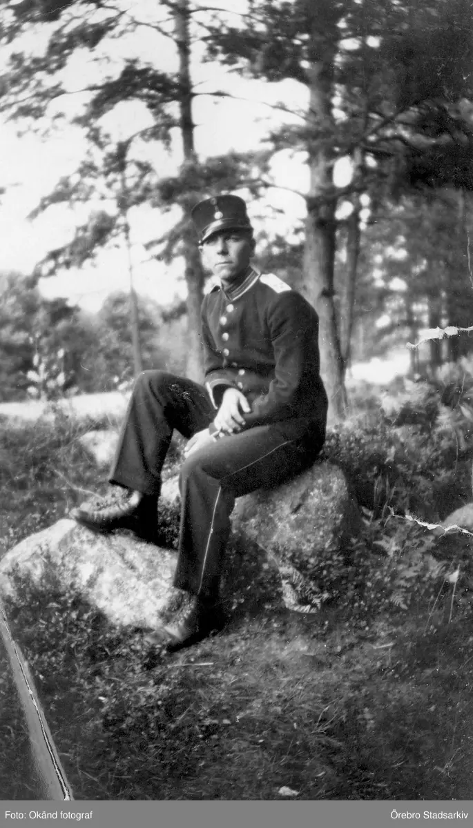 Lennart i uniform sittande på sten i skogsdunge, 1930-tal