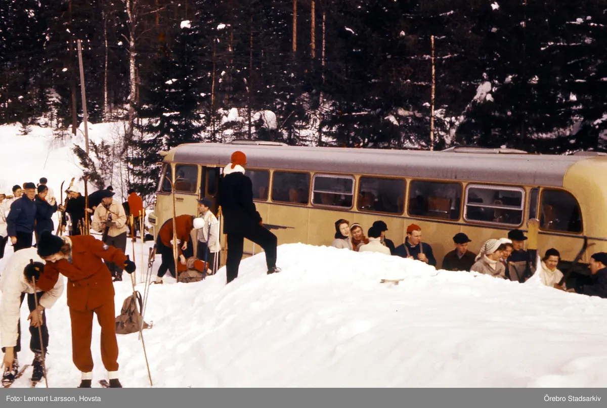 Buss lämnar skidåkare i Lockenkil, 1950-tal