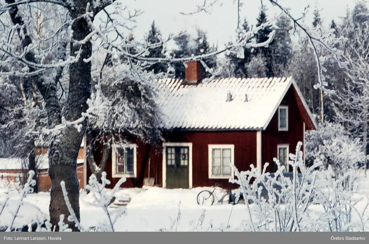 Cykel i snödriva framför hus i Yxtabacken i Hovsta, 1970-tal