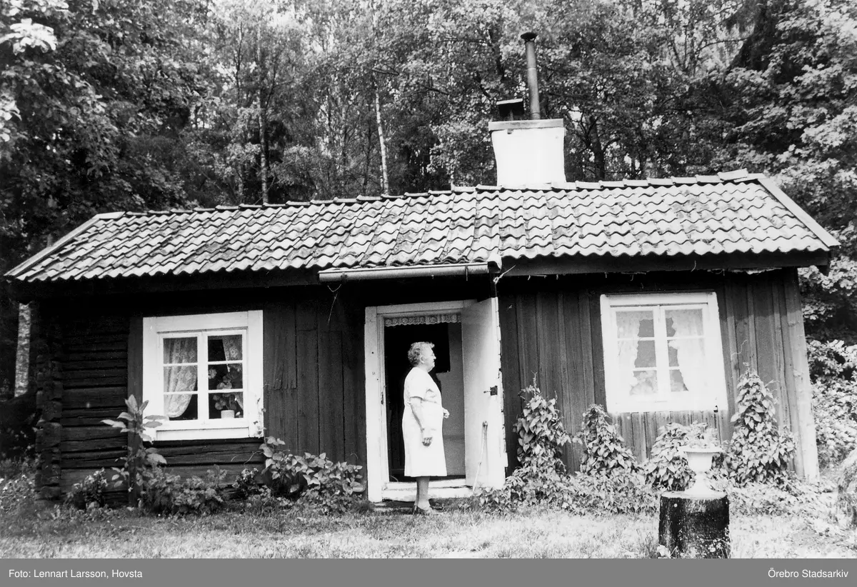 Greta Olsson framför stuga i Yxta i Hovsta, 1984