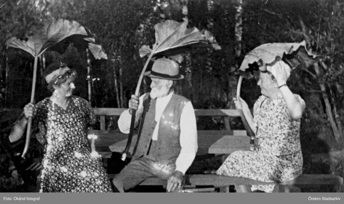 Grupp i Hovsta med rabarberblad, 1930-tal
