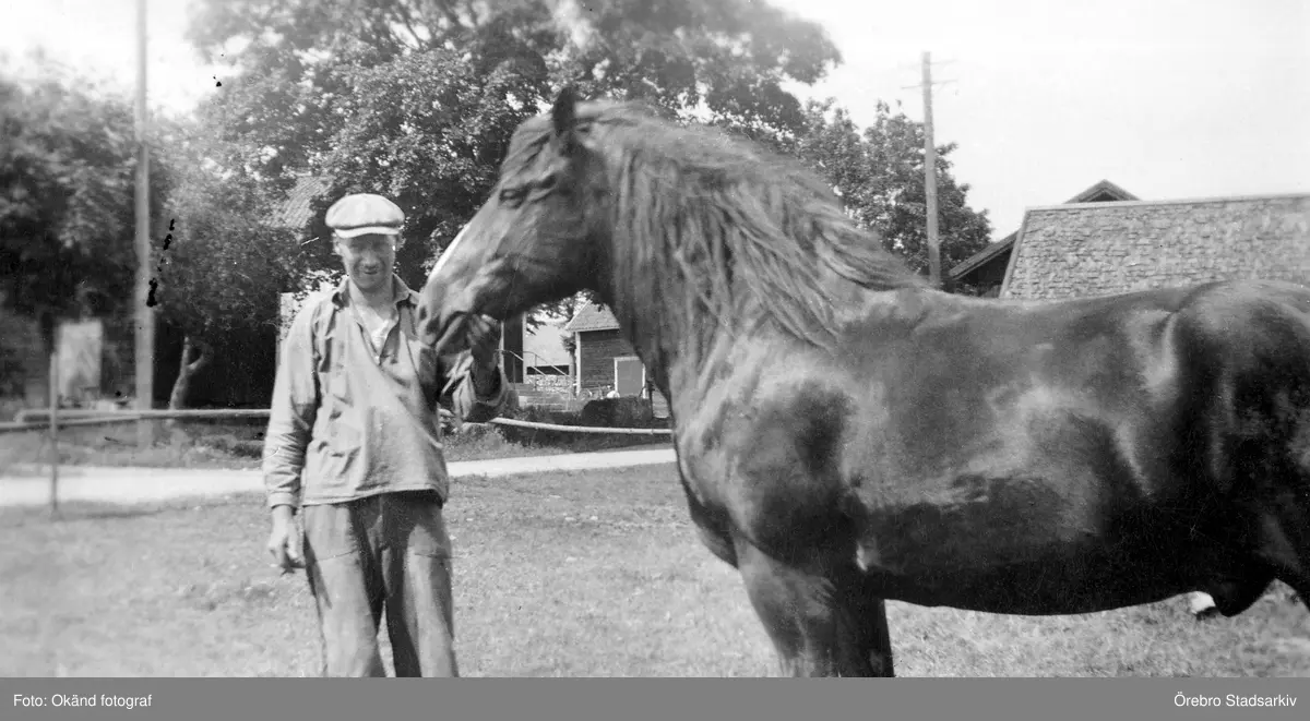 Drängen Elis håller en häst i Gryt i Hovsta, 1940-tal