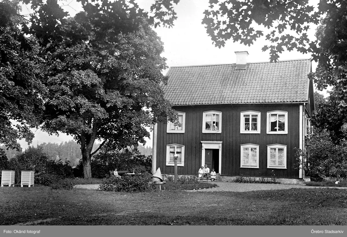 Grupp sittande på trappen till gård i Förlunda i Hovsta, 1920-tal