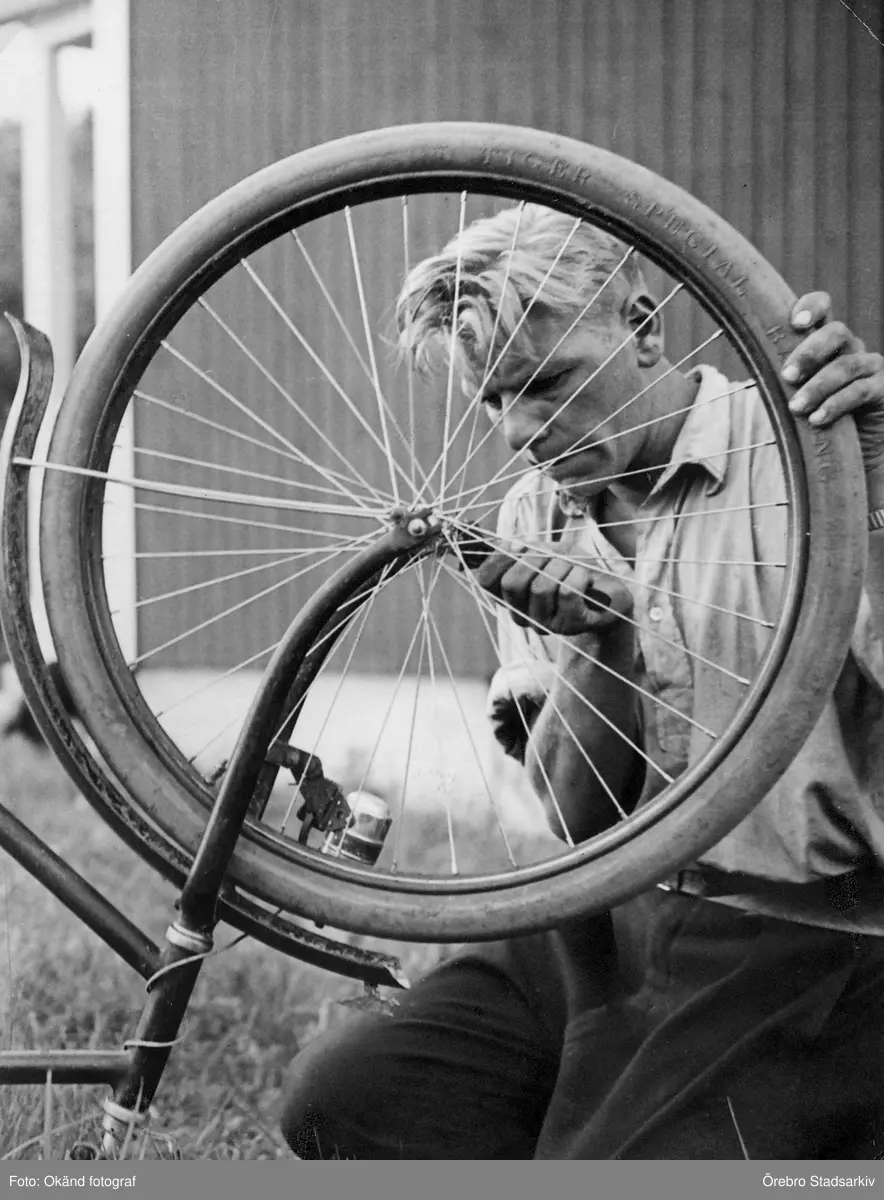 Lennart lagar sin cykel i Hovsta 1930-tal