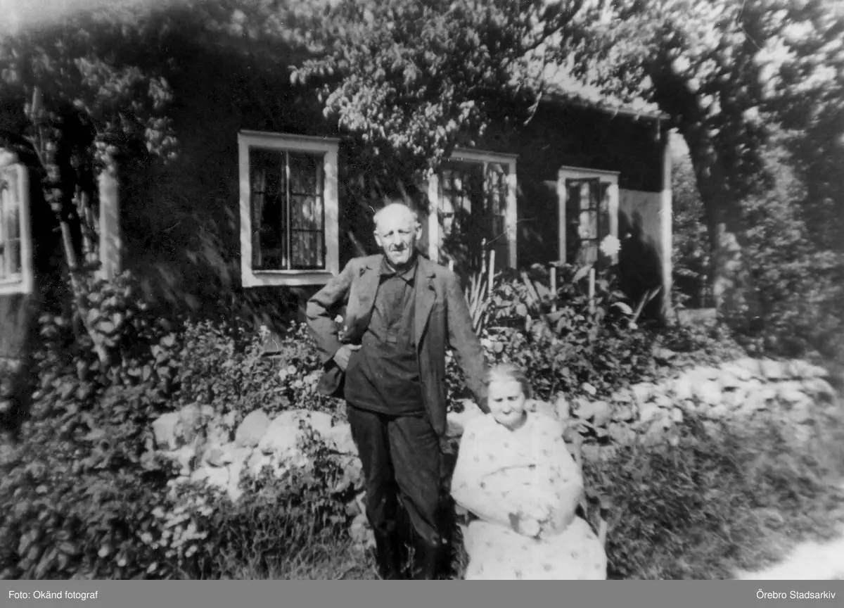 Per och Hanna Pettersson framför stugan i Yxtabacken i Hovsta, 1940-tal