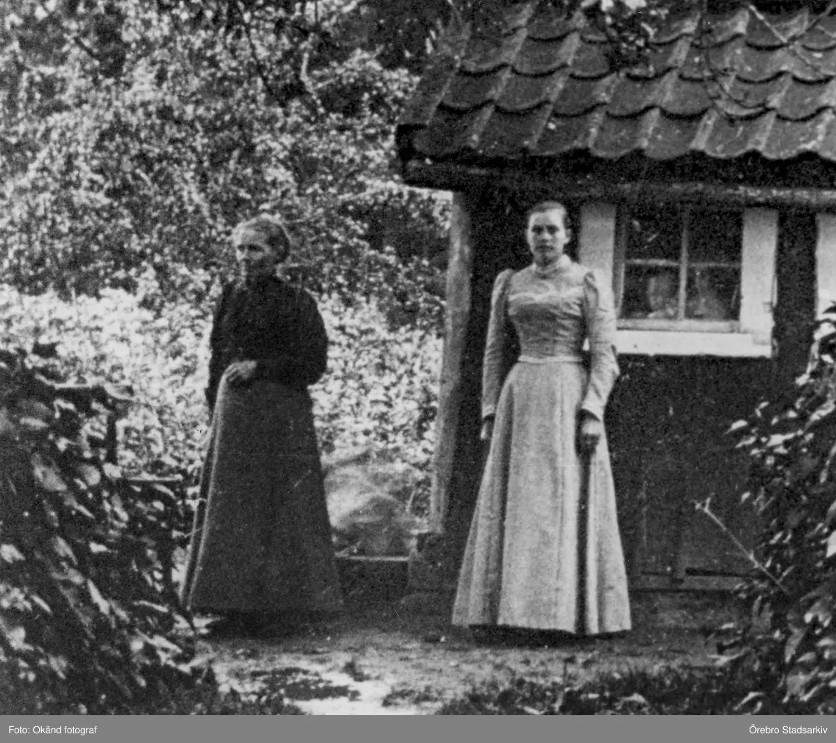Två kvinnor vid hus i hus i Yxtabacken i Hovsta, ca 1900