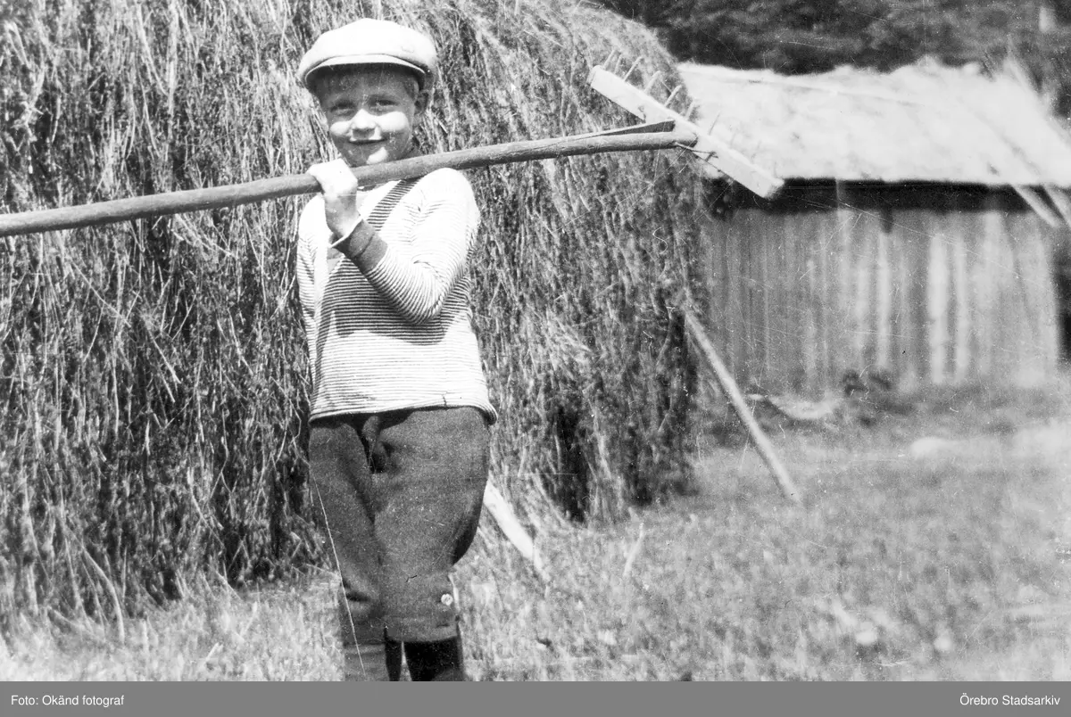 Pojke med räfsa i Yxstabacken i Hovsta, ca 1925