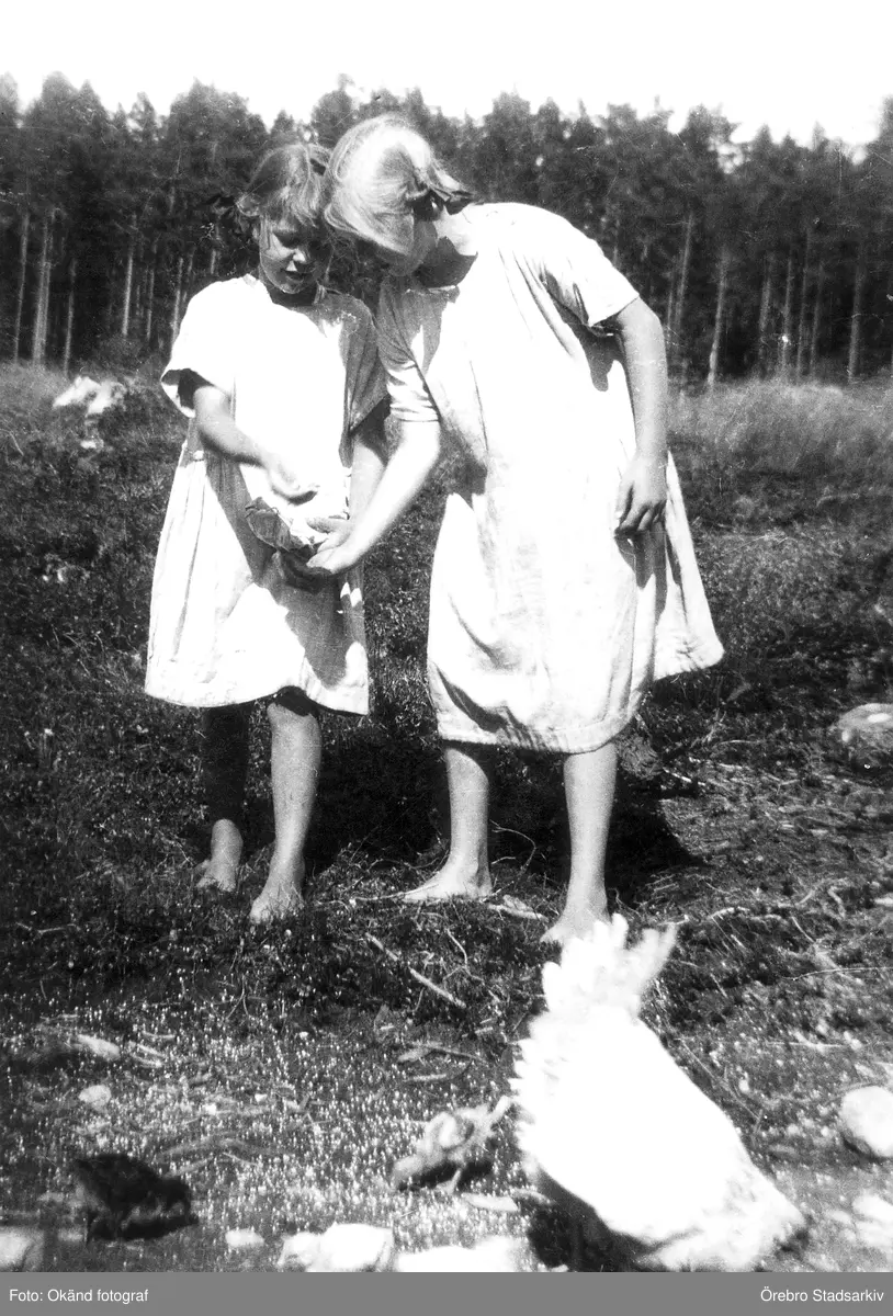 Flickor som matar höns vid Solstugan i Hovsta, 1920-tal