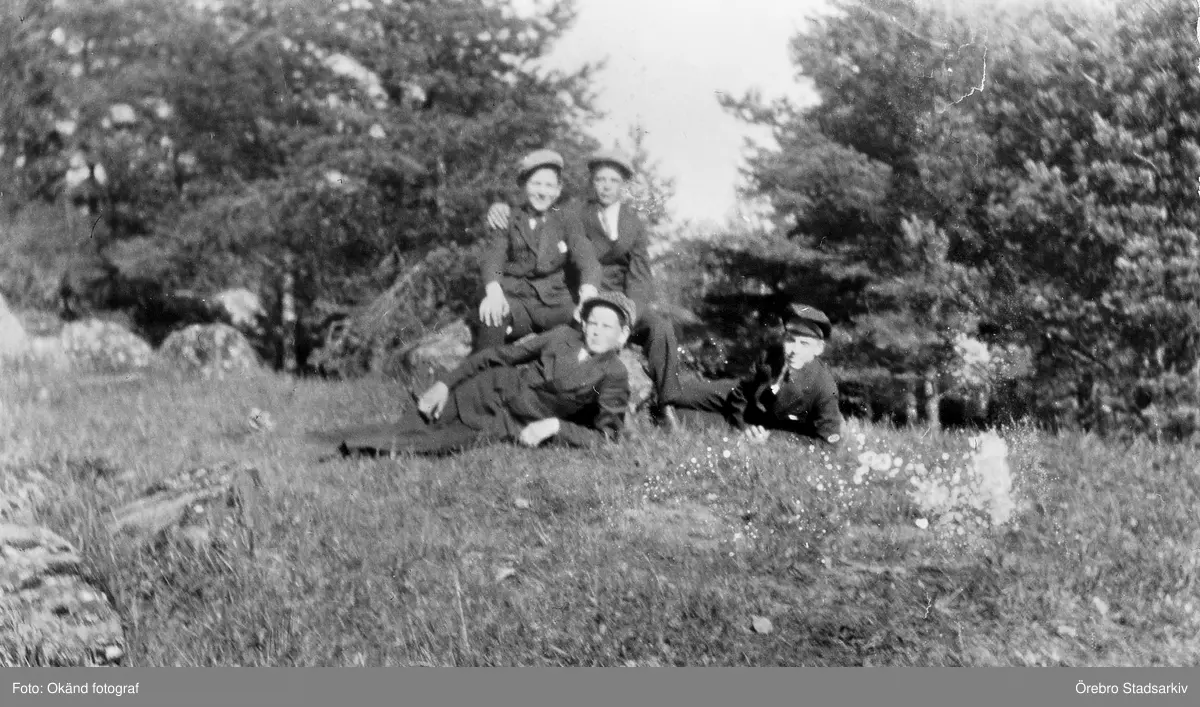 En grupp med unga pojkar på äng i Yxtabacken i Hovsta, 1920-tal