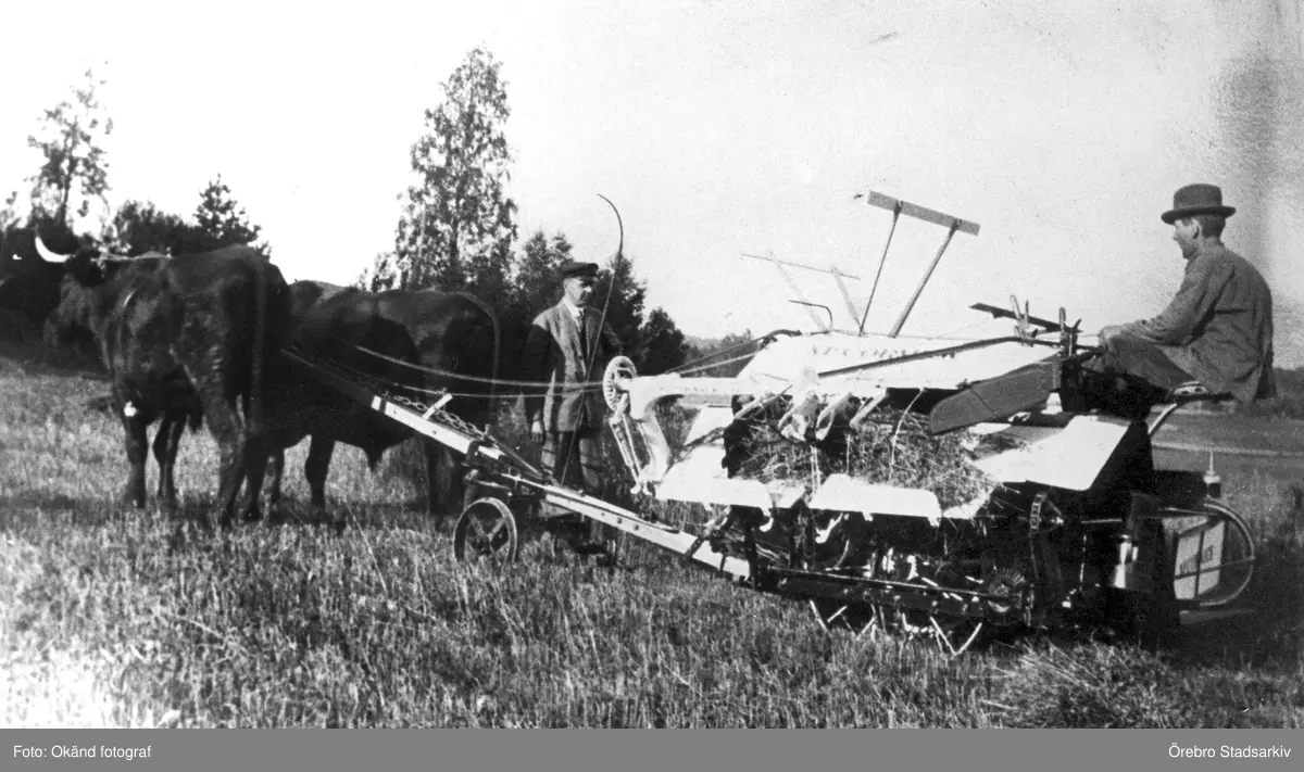 Åhman övervakar Holger Karlsson som provkör självbindaren i Hovsta, 1940-tal