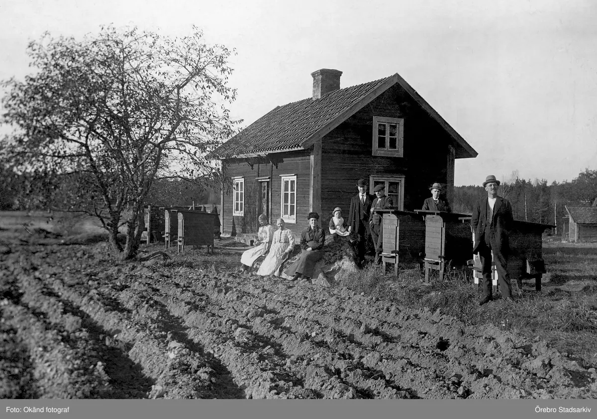 Familjena Larsson och Anderson framför stuga i Hovsta, 1920-tal