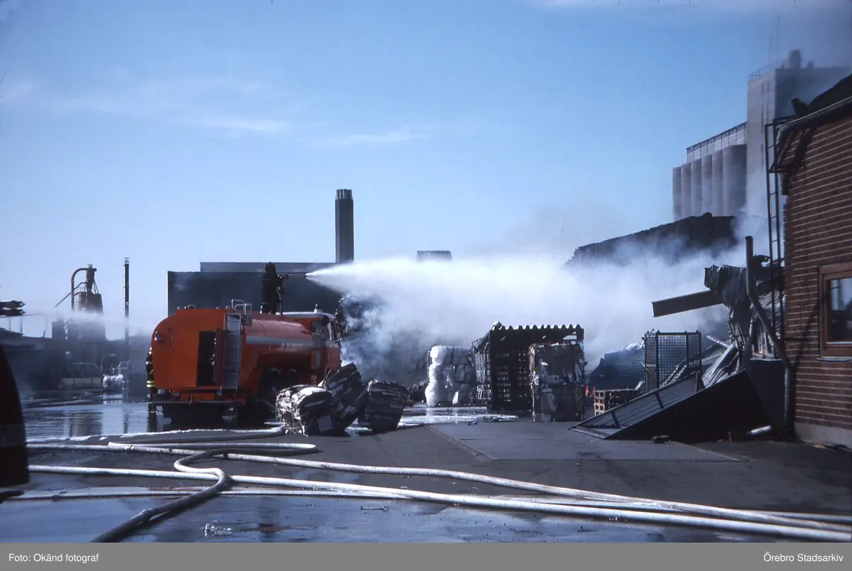 Brandkåren sprutar vatten vid branden vid Gotthards, april 1982