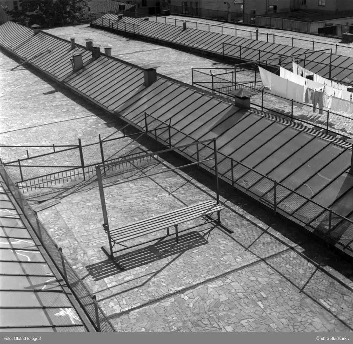 Mattpiskställning och tvättlinor på gården Östra Bangatan 42, 1960-tal